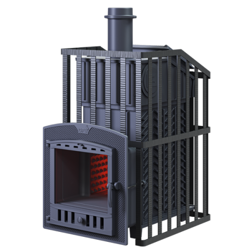 Печь GFS-ЗК в сетке 18 (М) Ураган - расширенный комплект печи GFS-ЗК в сетке. Максимально приближенный вариант печи для режимов русской парной, имеющий непосредственно закрытую чугунным коробом каменку, дверцу для пара с ручкой из бука, увеличенную до 50 см чугунную стартовую трубу. Печь легко модернизируется до полноценной печи предназначенной для Русской бани путем замены стальной сетки на каменную облицовку без демонтажа дымохода.