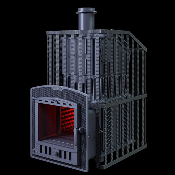 Печь для бани GROZA 18 (П2) Ураган - расширенный комплект печи в сетке. Максимально приближенный вариант печи для режимов русской парной, имеющий непосредственно закрытую чугунным коробом каменку, дверцу для пара с ручкой из бука, увеличенную до 50 см чугунную стартовую трубу. Печь легко модернизируется до полноценной печи предназначенной для Русской бани путем замены стальной сетки на каменную облицовку без демонтажа дымохода.